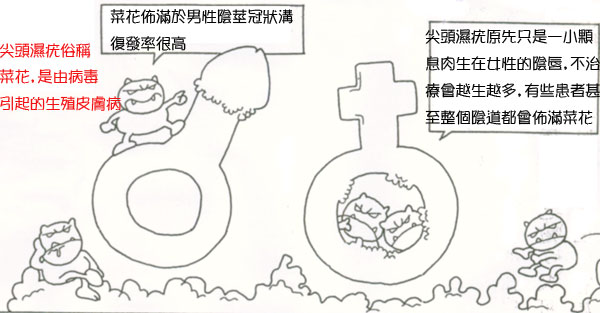 "菜花"的醫學名詞是尖圭濕疣, 也叫陰部濕疣或性濕疣,是由一種叫做人類乳頭狀瘤濾過性病毒〈HPV〉所引起。 大部份是經性行為傳染, 潛伏期是三個月, 但也有長達一年之久的。長出的位置大部分在外陰部及會陰男性的龜頭、包皮、陰莖, 女性的大小陰唇是好發的地方。少部份在男性的尿道及女性的陰道子宮頸。而經由口交或肛交, 也會長在口腔和肛門。發病時是在表皮長出一片扁平的突出物, 若在陰濕的部分, 如包皮內面, 則可能長成一團很大的花狀物。在治療過後,又很容易在同一地方或旁邊復發。,而且同一部位可能多處感染,性接觸可感染性器官、陰道、子宮頸,肛交可感染肛門、直腸,口交可感染口腔。