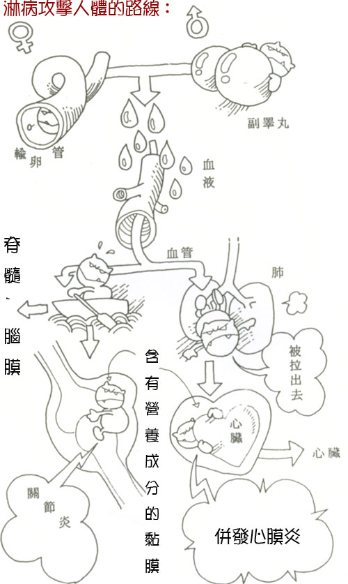 慢性淋病一拖再拖會什麼後果。男人會副睾丸輸精管發炎而阻塞,除此以外,對別的器官所造成的合併症,關節炎、心內膜炎、肝周圍炎、急性化膿結膜炎。