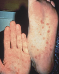 第二期梅毒感染者:硬下疳消退後,全身皮膚出現紅疹(梅疹)不痛、不癢,血清檢查成(+)反應。