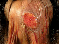 在男性陰莖冠溝包皮內外,尿道外端產生如米粒大小之”硬性下疳”表面破損、潰瘍但無痛癢之感覺。女性第一期梅毒亦無法察覺要等到小陰唇、陰道或子宮口糜爛時,才能發現。