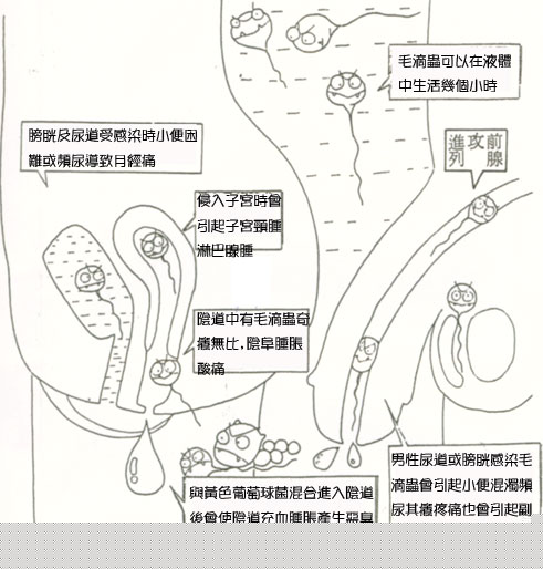 女性陰道內有毛滴蟲,陰道日夜遭受奇癢之苦,陰唇腫脹、酸痛、分泌物增加(很多人常把它當做正常白帶),陰道中如有其他細菌存在,尤其黃色葡萄球菌,就會一起鑽入陰道而使陰道充血、腫脹、酸痛、產生更多分泌物,有異臭、性交困難。黃色葡萄球菌能使子宮細胞鬆弛,腹股溝、淋巴腺腫。毛滴蟲侵入子宮肌肉中,子宮頸乳腫導致月經痛,膀胱、尿道感染時小便困難或頻尿。