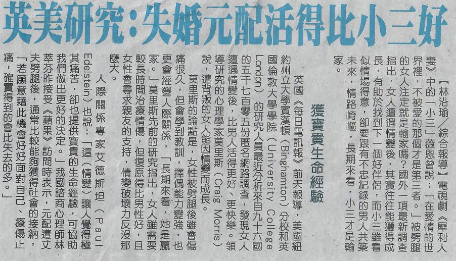 >醫療報導> 英美研究:失婚元配活得比小三好
