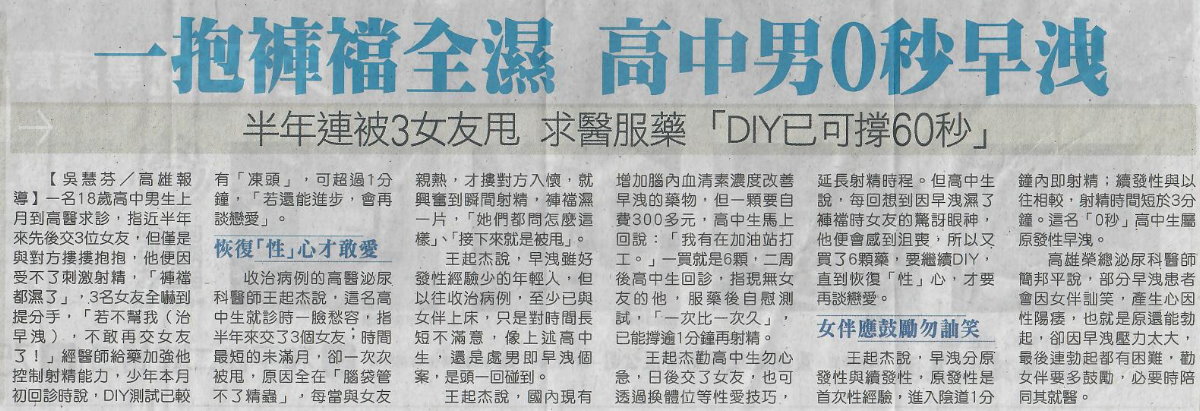 >醫療報導> 一抱褲襠全濕 高中男0秒早洩